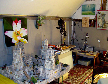 Aus einem früheren Heuboden wurde die Ideenschmiede. Die Visionen entfalten sich hier am Besten. Das Umsetzen in die Praxis erfordert das Arbeiten mit vielen Materialien.Farbtöpfchen, Gipsköpfe und Kleistertöpfe zieren die Tische ebenso wie Dutzende Gläschen und Tuben mit Öl- und Acrylfarben. Es wird auch mit seltenen Materialien, wie Edelmetallen und Glas gearbeitet. Der Künstler verwendet auch Asche, Blut und "Mixturen der besonderen Art" für seine Exponate. Auch hier gilt sein Wahlspruch: