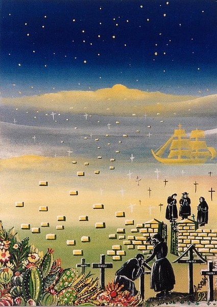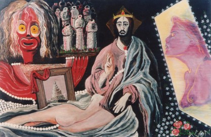 Und ich sah die Frau, betrunken von dem Blut der Heiligen und von dem Blut der Zeugen Jesu. Und ich wunderte mich sehr, als ich sie sah. Und auf ihrer Stirn war geschrieben ein Name, ein Geheimnis: Das große Babylon, die Mutter der Hurerei und aller Greuel auf Erden. Und die Frau war bekleidet mit Purpur und Scharlach und geschmückt mit Gold und Edelsteinen und Perlen und hatte einen goldenen Becher in der Hand; voll von Greuel und Unreinheit ihrer Hurerei. (Off. des Johannes)