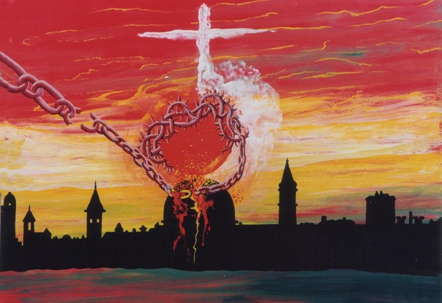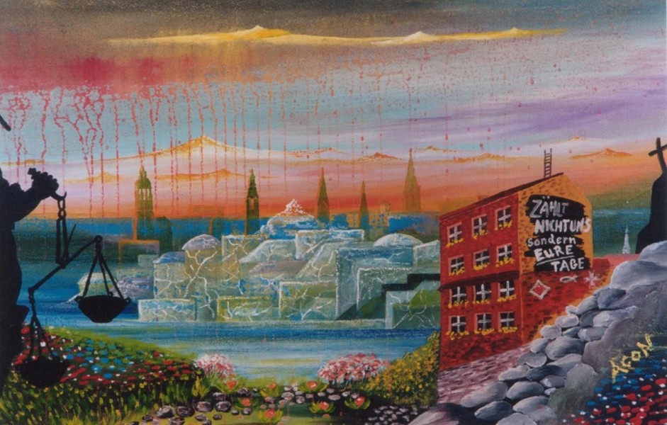Da werden die die Menschheit heimsuchenden apokalyptischen Reiter zur Verkörperung des Terrors, des Rüstungswahn, der Wirtschaftskrise und der Umwelt- Verschmutzung. Da steht Armageddon, wo die bösen Geister die Könige der gesamten Erde zur Entscheidungsschlacht versammeln für den dritten Weltkrieg; ist das böse, die Menschheit befallene Geschwür nichts anderes als ein durch die fortschreitende Zerstörung der Ionosphäre grassierender Hautkrebs; kann mit dem dämonischen, aus dem Rachen der Finsternis aufsteigenden Heuschreckenschwarm nur ein Geschwader raketenbestückter Kampfhubschrauber gemeint sein.