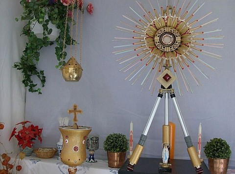 Hinter dem Altar leuchten viele kleine Sterne und bringen gedämpftes Licht in den Raum. Mit seidigen Blumen und Grünpflanzen ausgeschmückt; überdauerte es bis heute extreme Hitze- und Kältegrade.