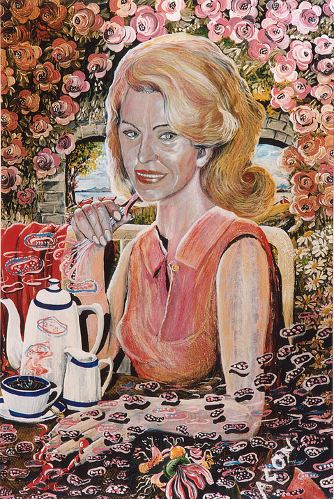 Das allegorische Bild von Anne lehnt am Schrank, da ich es dort gut betrachten kann. Noch fehlen meine Visionen zum Bild, aber Kaffeegeschirr habe ich bereits auf den Tisch gemalt; und meiner ‚Mona Lisa’ einen Fingerring mit dem roten Stein der Liebe angesteckt. In den begonnenen Diskurs mischen sich unsere Kinder ein. Der Didi behauptet, der Deckel der Kaffeekanne schwebt über der Kanne – Richy behauptet, der Deckel passt! Didi sagt, der Fingerring sei am Finger – Richy dagegen meint, der Ring liege zwischen den Fingern.